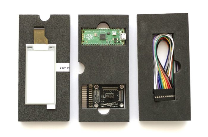 On the hardware side, the kit includes a Raspberry Pi Pico board based on the dual-core Cortex-M0+ RP2040, a Pervasive Displays e-Paper EPD Extension Kit Gen 3 (EXT3-1) , a 20-way cable, a 2.66″ monochrome e-paper display, a printed Quick Start Guide and pins maps for connection. On the software side, the open-source Pervasive Displays Library Suite is available for download. The wiki offers an introduction to the concepts of the e-paper technology. The concise articles illustrated with diagrams offer a gradual approach to learn how an e-paper screen works and how to take the most benefit of it.